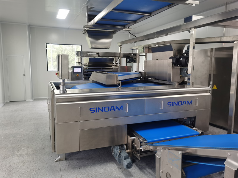 面團通過疊層機三次壓軋,切片疊加至8~16層面皮。輸送至成型軋輥,該機能將回面始終處于面 皮底部,經切片式疊層機生產出來的餅干層次感 強、口感松脆、酥化程度極高,配合機器上的撒 酥機,可生產蘇打餅干和其它高檔餅干。